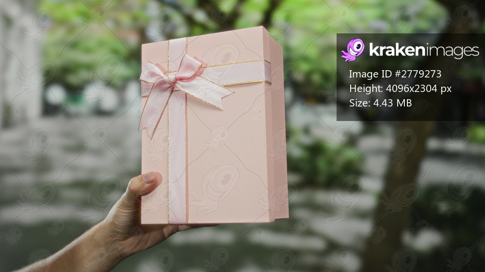 Hand holding a pink gift box with ribbon in an outdoor city street showcasing a thoughtful gesture and surprise.