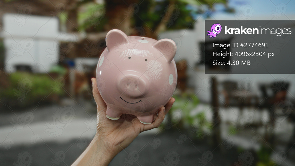 Hand holding a pink piggy bank outdoors on a city street, emphasizing savings and finance in an urban setting.