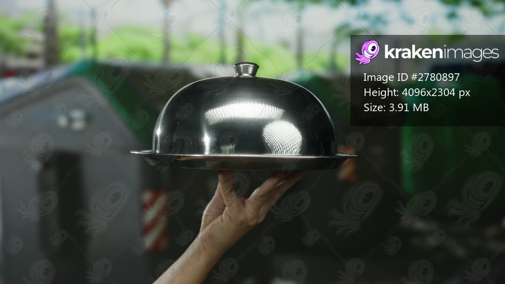 Hand holding a silver cloche outdoors near recycling containers in a city setting, highlighting urban life.