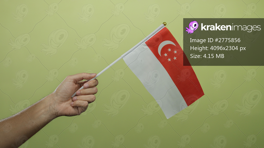 Hand holding a singaporean flag against a yellow wall, showcasing patriotism and national pride in a simple, isolated setting.