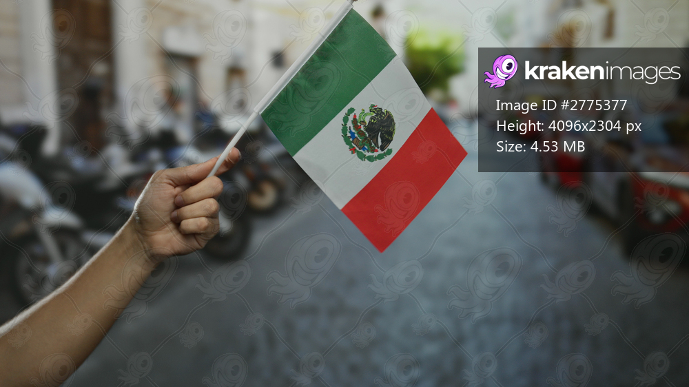 Hand holding a small mexican flag waving on a vibrant city street, symbolizing national pride with a blurred urban background and caucasian male presence in mexico. - Kraken Images