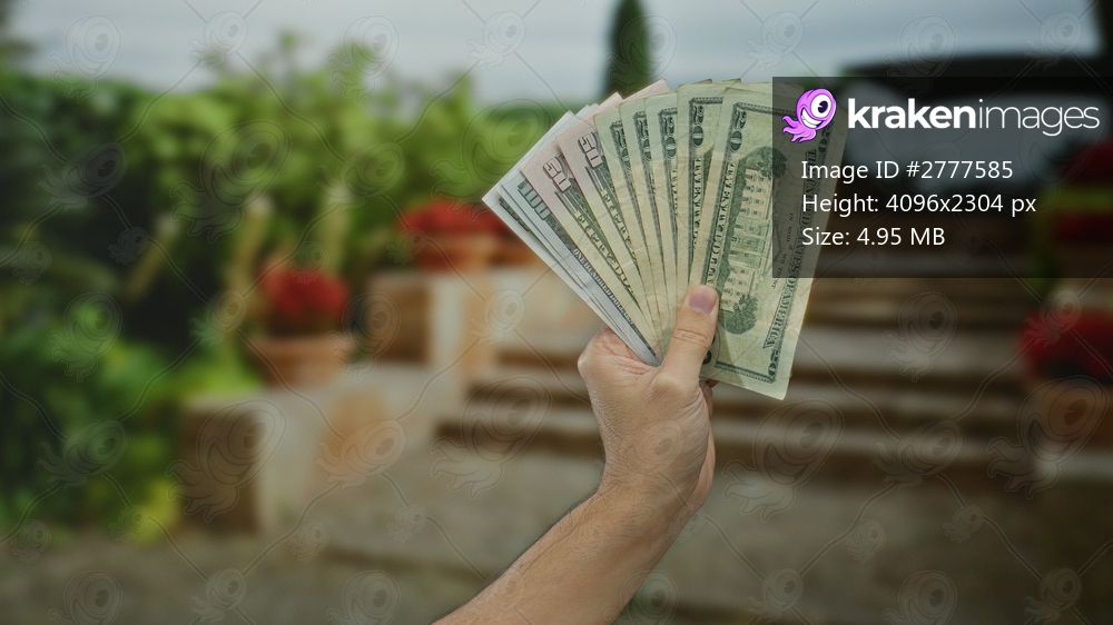 Hand holding american dollars outdoors, showcasing money in a city setting, highlighting financial themes and urban lifestyle context.