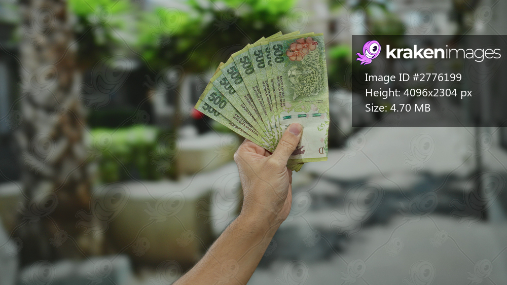 Hand holding argentine pesos on a city street showcasing 500 banknotes outdoors with blurred urban background, evoking commerce and finance with male presence. - Kraken Images