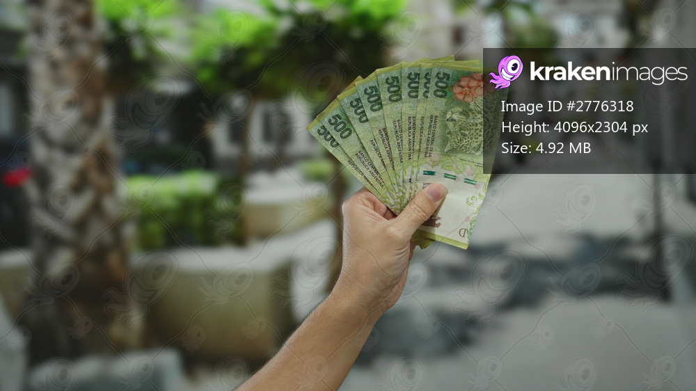 Hand holding argentine pesos on a city street showcasing 500 banknotes outdoors with blurred urban background, evoking commerce and finance with male presence. - Kraken Images