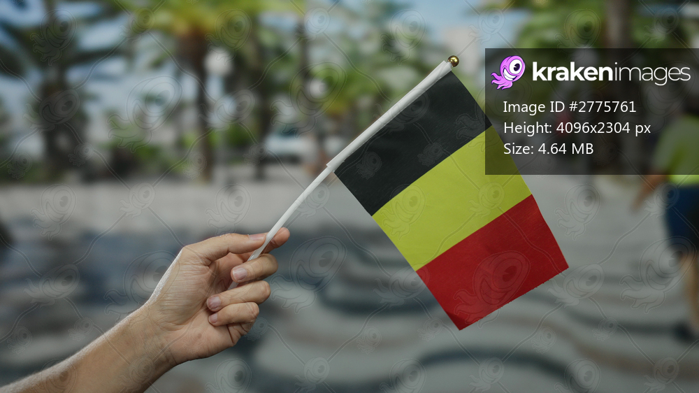 Hand holding belgian flag in an outdoor city street setting with blurred background of palm trees and people, highlighting national pride and urban environment. - Kraken Images