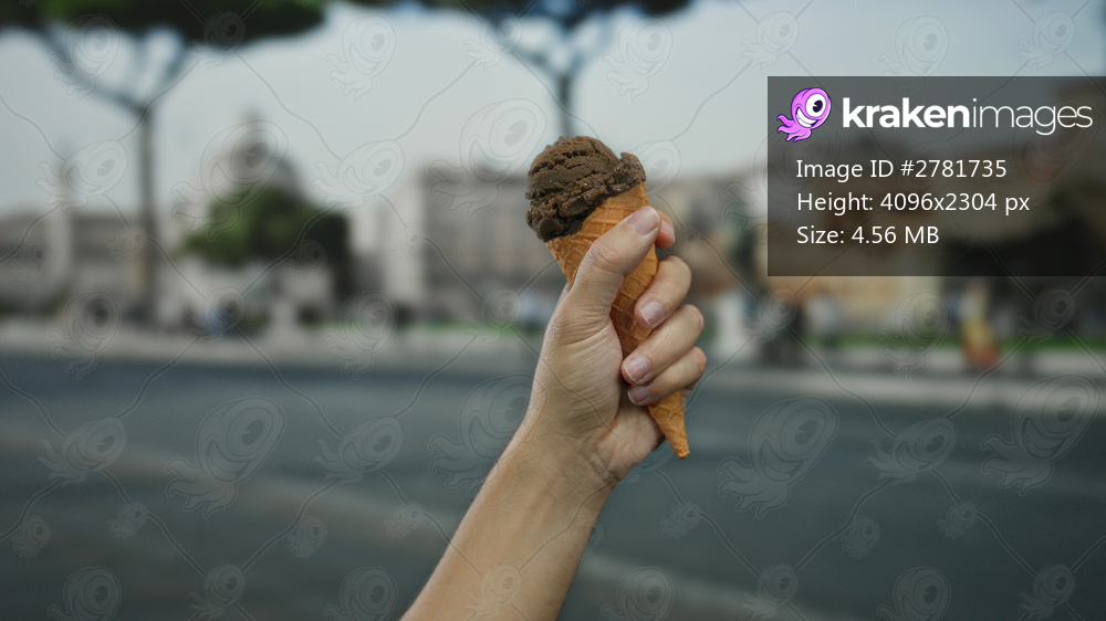 Hand holding chocolate ice cream cone on city street with blurred cityscape in background depicting a sunny outdoor scene.
