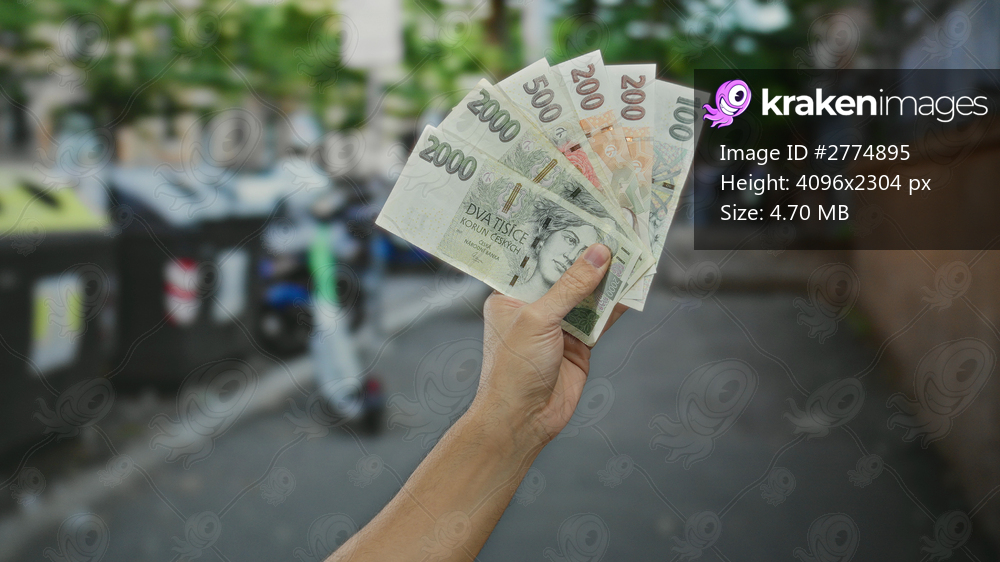 Hand holding czech koruna banknotes on a street near recycling bins, depicting a caucasian male in an urban outdoor city setting focused on money and environment. - Kraken Images