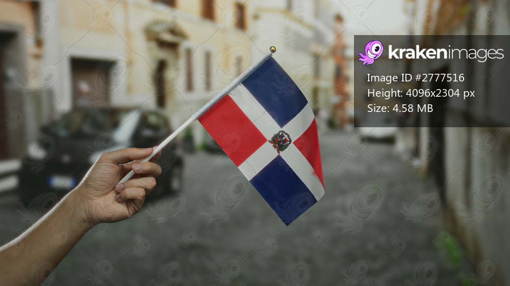 Hand holding dominican republic flag on a city street with caucasian male in an urban outdoor town setting.