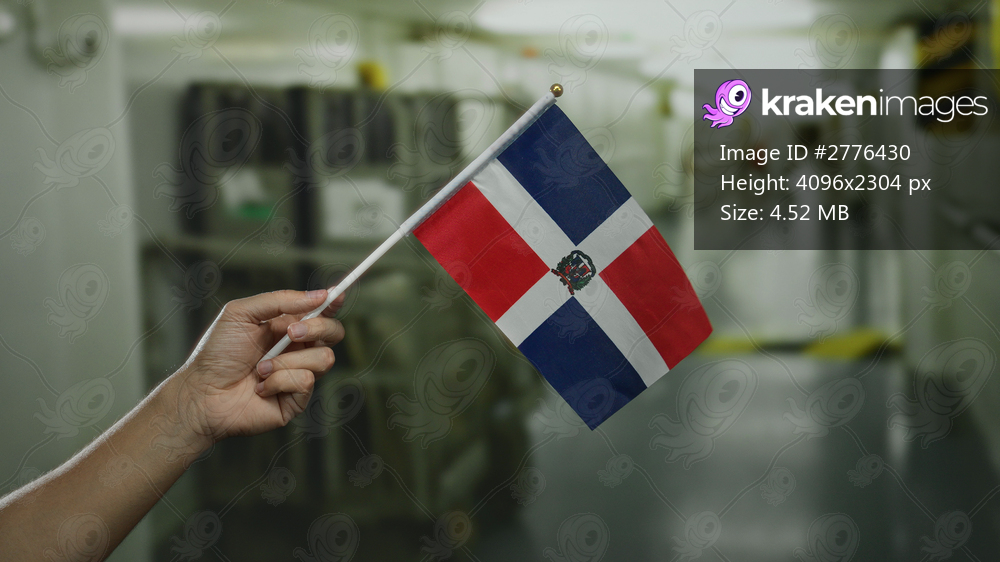 Hand holding dominican republic flag on a cruise boat, capturing a sense of national pride and exploration on an outdoor seaside voyage.