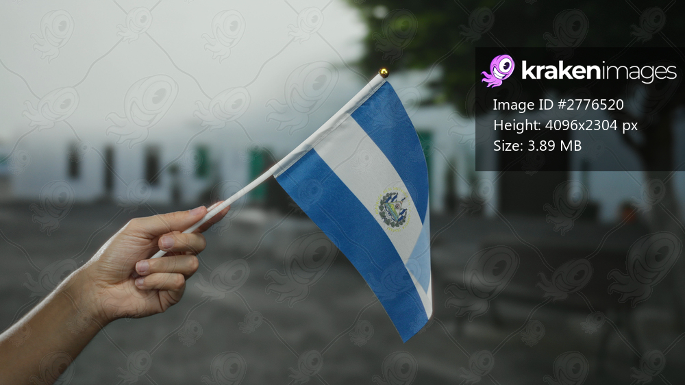 Hand holding el salvador flag outdoors in a city setting, symbolizing national pride and identity with a blurred urban background enhancing the focus on the flag. - Kraken Images