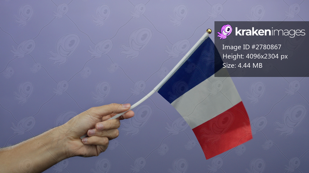 Hand holding french flag isolated on a purple background, symbolizing patriotism and national pride in france with the vibrant tricolor visible.