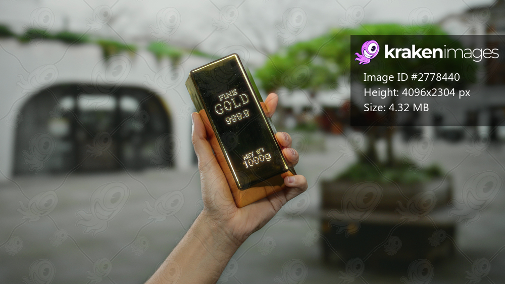 Hand holding gold bar outdoors with city background, symbolizing wealth and investment in urban setting.