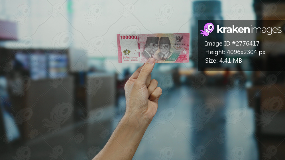 Hand holding indonesian rupiah at airport terminal illustrating travel and finance with focus on banknote indoors by a man showcasing currency in busy surroundings. - Kraken Images