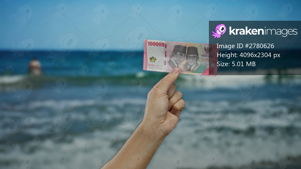 Hand holding indonesian rupiah banknote at seaside beach with blue ocean background, signifying travel and finance outdoors featuring a caucasian man.