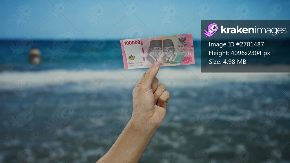 Hand holding indonesian rupiah banknote at seaside beach with blue ocean background, signifying travel and finance outdoors featuring a caucasian man.