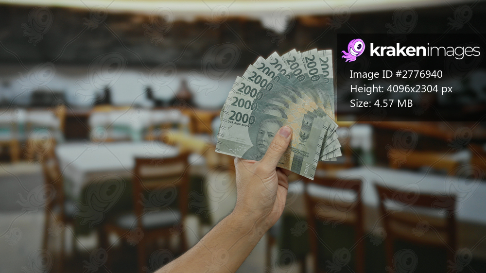 Hand holding indonesian rupiah banknotes inside a cozy restaurant, showcasing currency indoors with a blurred background, alluding to financial transactions with a man present. - Kraken Images