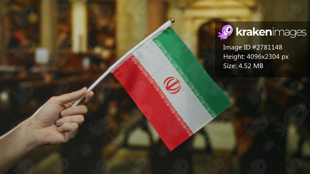 Hand holding iranian flag indoors, with a background of a church setting and people, highlighting cultural connection and diversity.