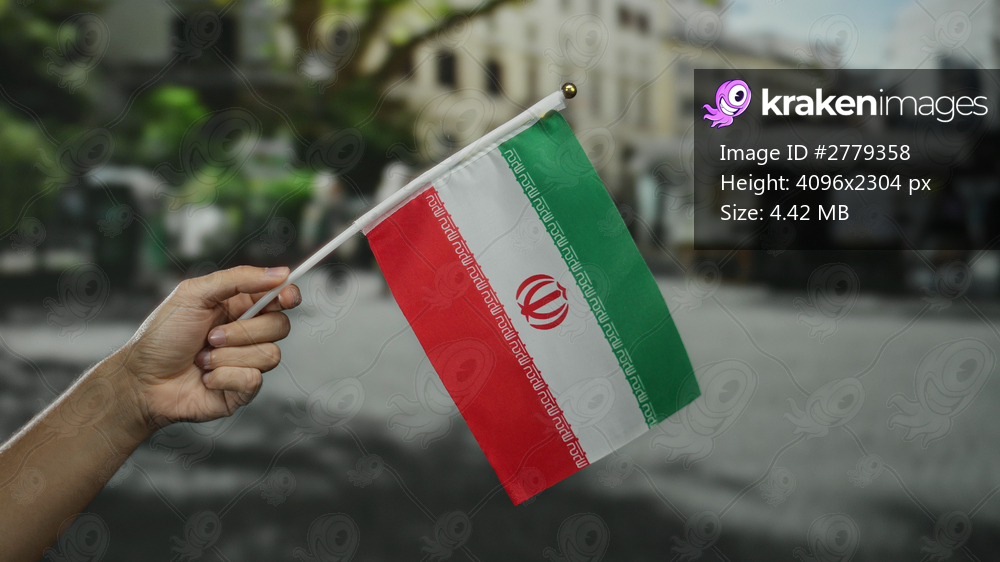 Hand holding iranian flag outside on city street with blurred background, signifying patriotism, culture, and international presence in busy urban environment. - Kraken Images