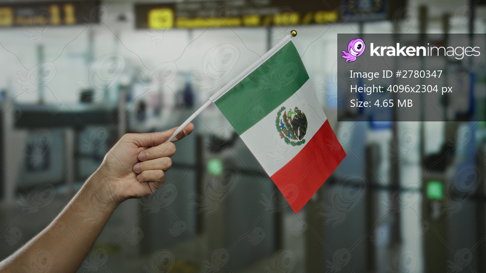Hand holding mexican flag in airport terminal highlights travel and patriotism indoors with blurred background.