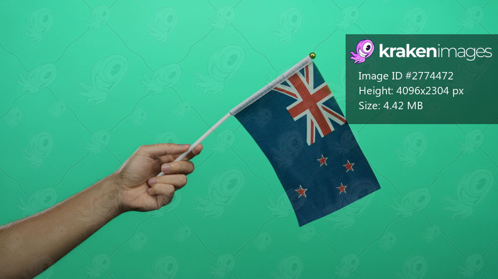 Hand holding new zealand flag against green background, representing national pride and patriotism.