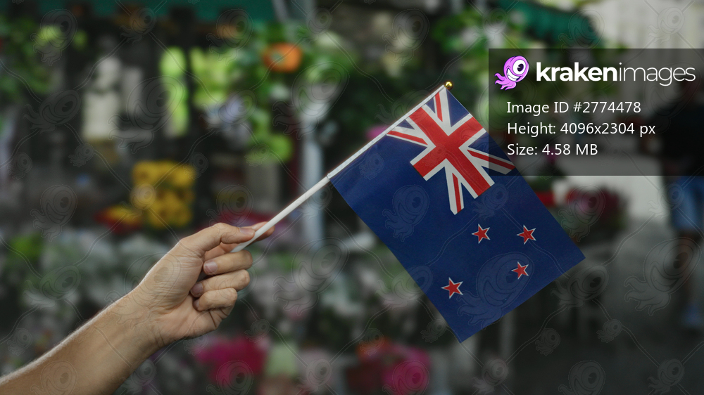 Hand holding new zealand flag outdoors near flower shop on city street, capturing vibrant urban atmosphere and national pride.