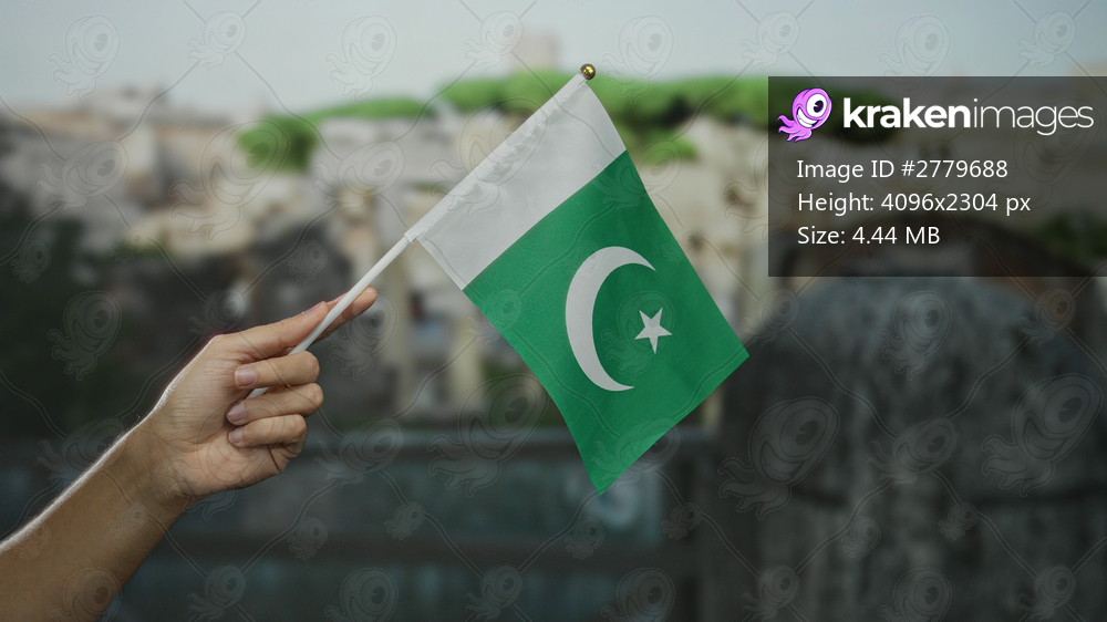 Hand holding pakistani flag outdoors in front of ancient roman ruins with blurred city background indicating exploration and heritage.