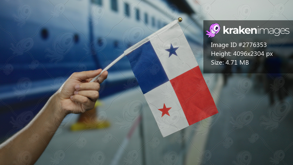 Hand holding panama flag near a seaside port with a large boat, capturing outdoor spirit, manly presence, and a nautical vibe.