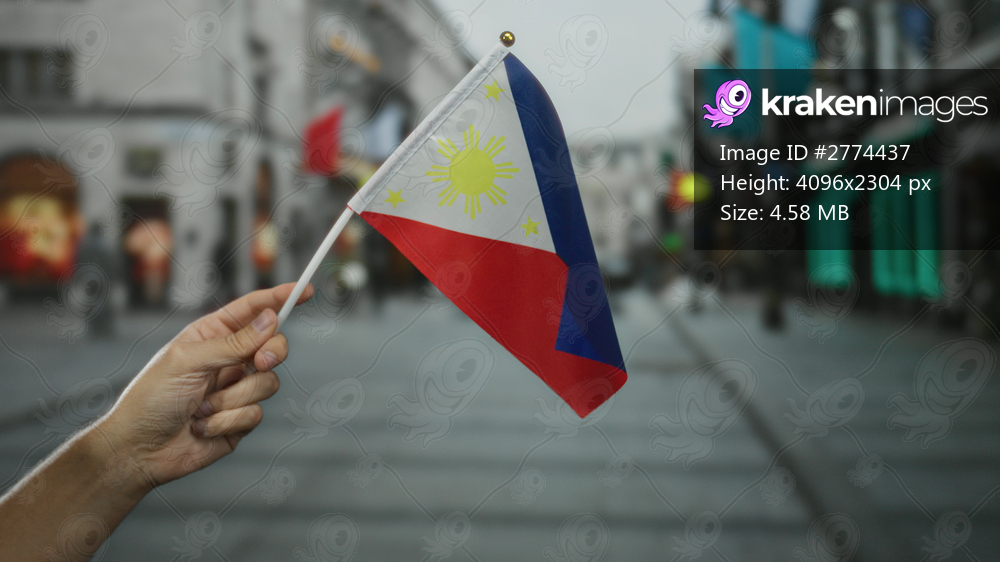 Hand holding philippine flag in city street with caucasian man outdoors showcasing national pride and cultural identity on a busy urban day.
