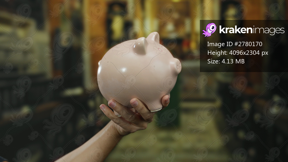 Hand holding piggybank in church setting highlights man in indoor environment suggesting financial theme within religious context.