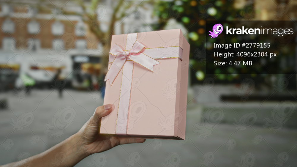 Hand holding pink gift box with ribbon outdoors in city setting, highlighting present in urban environment during holiday season with blurred background for festive effect. - Kraken Images