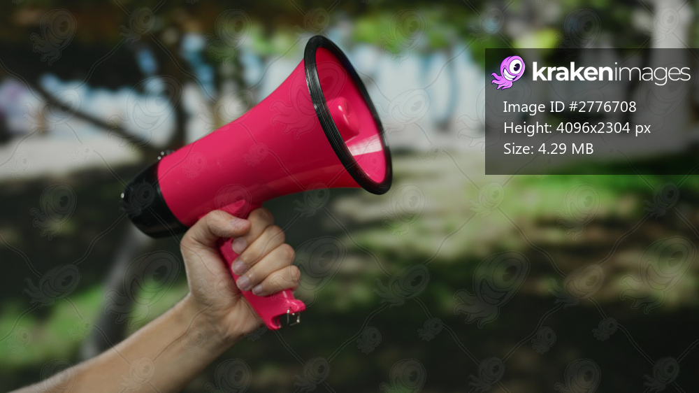 Hand holding pink megaphone in outdoor park setting with blurred greenery providing a vibrant background.