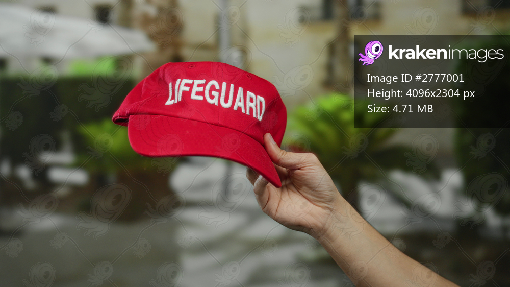 Hand holding red lifeguard cap in city street setting, capturing casual urban lifestyle and outdoor activities, with focus on clothing, hand, and vibrant color contrast. - Kraken Images