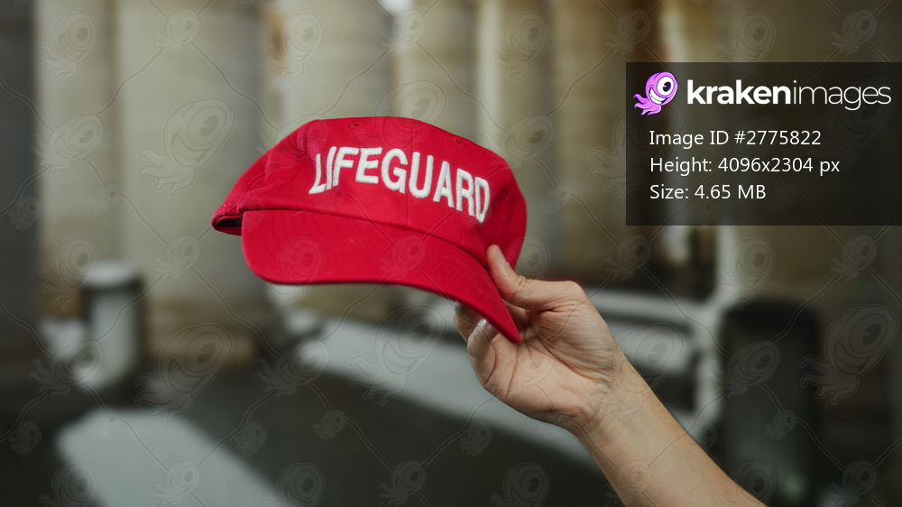 Hand holding red lifeguard cap outdoors with blurred city background showcasing lifeguard, hand, red, cap, outdoor, street, city, town, man, caucasian. - Kraken Images