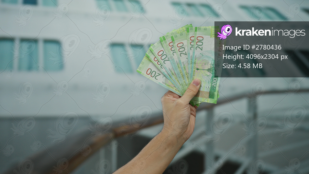 Hand holding russian rubles with banknotes on a seaside cruise ship, portraying travel luxury and financial success in a maritime outdoor setting.