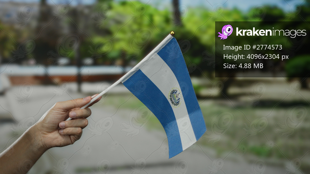 Hand holding salvadoran flag outdoors in a city street, symbolizing national pride and celebration on a sunny day, with blurred greenery in the background for a peaceful setting. - Kraken Images