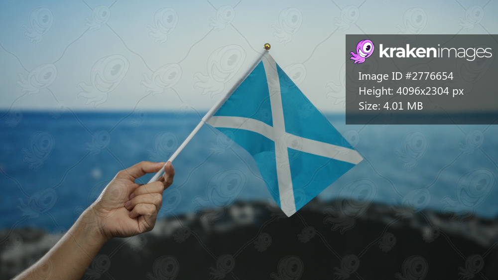 Hand holding scotland flag with seaside background showcasing patriotic spirit at the beach outdoors.