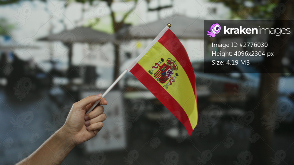 Hand holding spanish flag on outdoor cafe terrace in city with caucasian man in background creating a vibrant street scene symbolizing spanish pride.