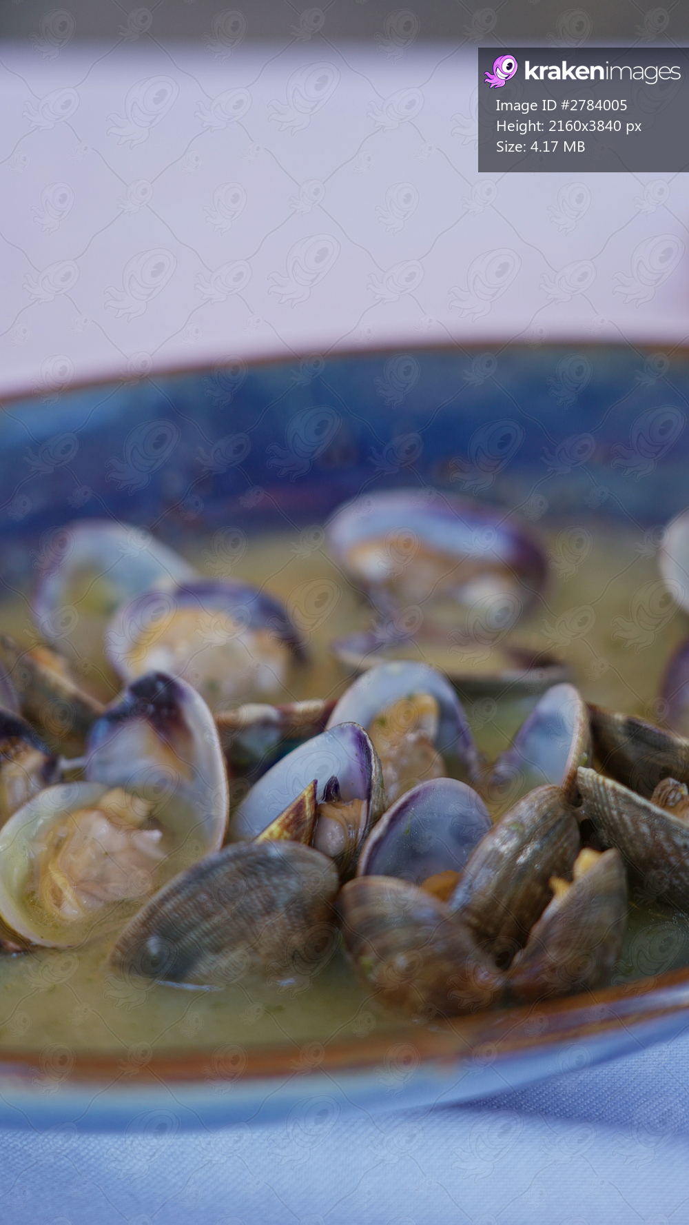 Hand holding spoon over bowl of clams in mediterranean sauce on restaurant table indoors with warm lighting creating cozy dining ambiance.