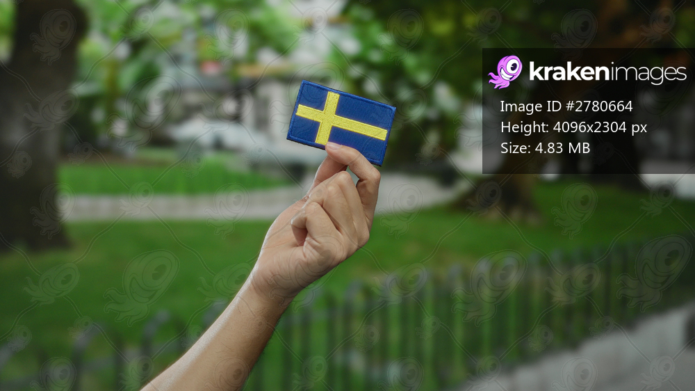 Hand holding swedish flag patch outdoor in a park setting, with caucasian man visible, representing swedish culture and identity.
