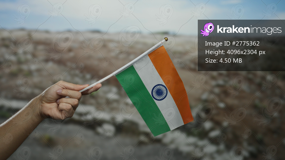 Hand holding vibrant indian flag against blurred outdoor park background, symbolizing national pride and celebration in a natural setting.