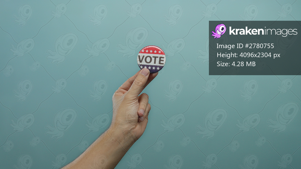 Hand holding vote button on blue background, showing political engagement and democracy, emphasizing election participation by caucasian man.