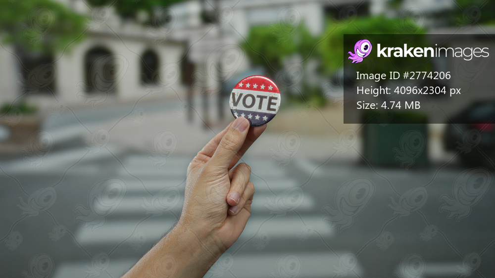 Hand holding vote button on urban street background, symbolizing election participation in city setting, highlighting civic engagement and political involvement outdoors by man. - Kraken Images