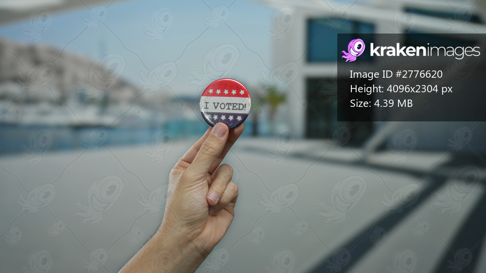Hand holding voting badge on seaside promenade with modern building background symbolizes civic engagement and election participation outdoors.
