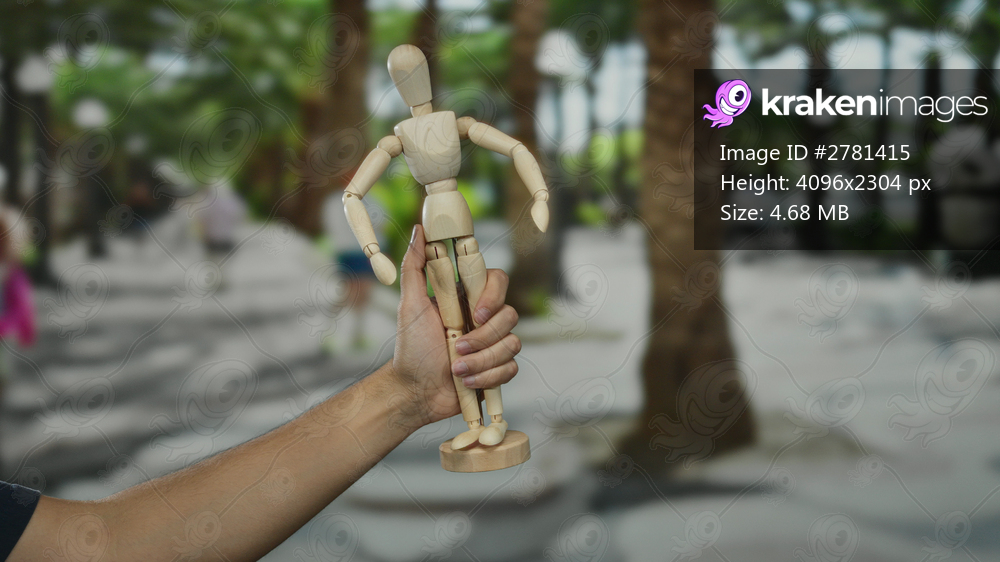 Hand holding wooden mannequin on a city street with blurred figures in the background depicting everyday life in an urban area.