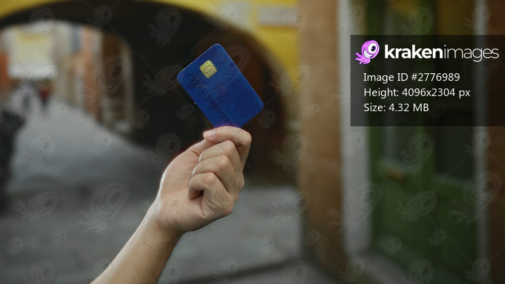 Hand of a caucasian man holding a blue credit card outdoors on a city street with green doors and archways in the background, conveying urban financial activity. - Kraken Images