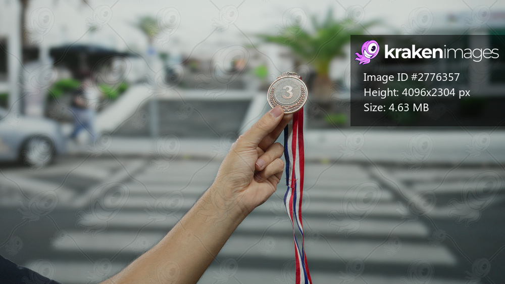 Hand of a caucasian man holding a third-place bronze medal with ribbon in an outdoor urban city street setting, symbolizing achievement and recognition. - Kraken Images