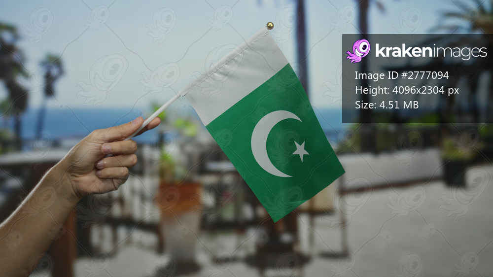 Hand of a man holding a small pakistan flag on a sunny terrace of a city café, embodying national pride in an outdoor urban environment with palm trees in the background.