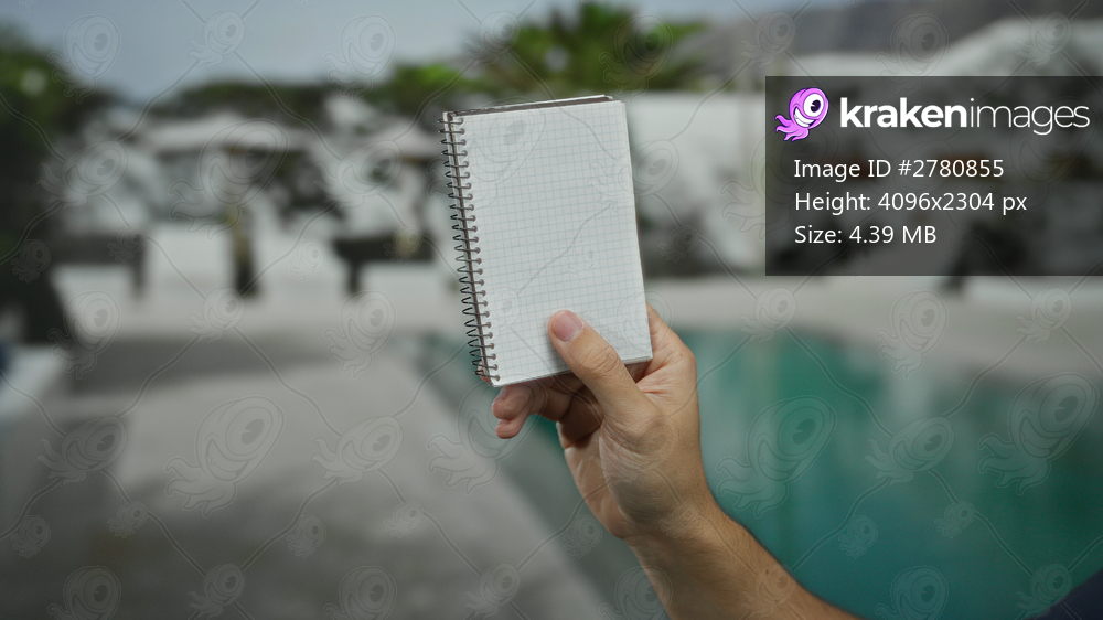 Hand of a man holding a spiral notebook at an outdoor poolside resort setting, suggesting leisure and planning.