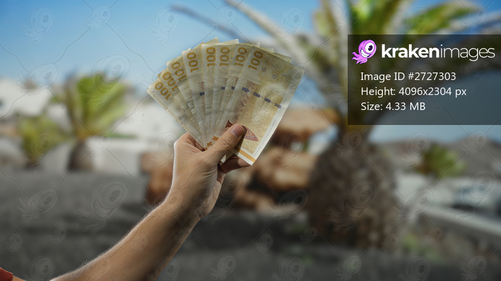 Hand of a man holding danish krone banknotes outdoors on a busy street in the city, palm trees in the background, showcasing currency prominently.