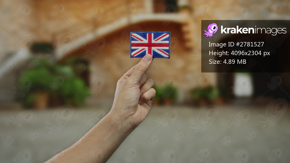 Hand of a man holding embroidered great britain flag on a street in a european town setting with stone buildings and greenery.